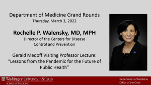 CDC director Rochelle Walensky, MD, MPH, a Washington University alum, is the 2022 Gerald Medoff Visiting Professor in the Department of Medicine. Walensky discussed the pandemic with William G. Powderly, MD, the J. William Campbell Professor of Medicine and co-director of the Division of Infectious Diseases. Their conversation on March 3, 2022 centered on domestic and global challenges facing public health officials as we emerge from the COVID-19 pandemic.